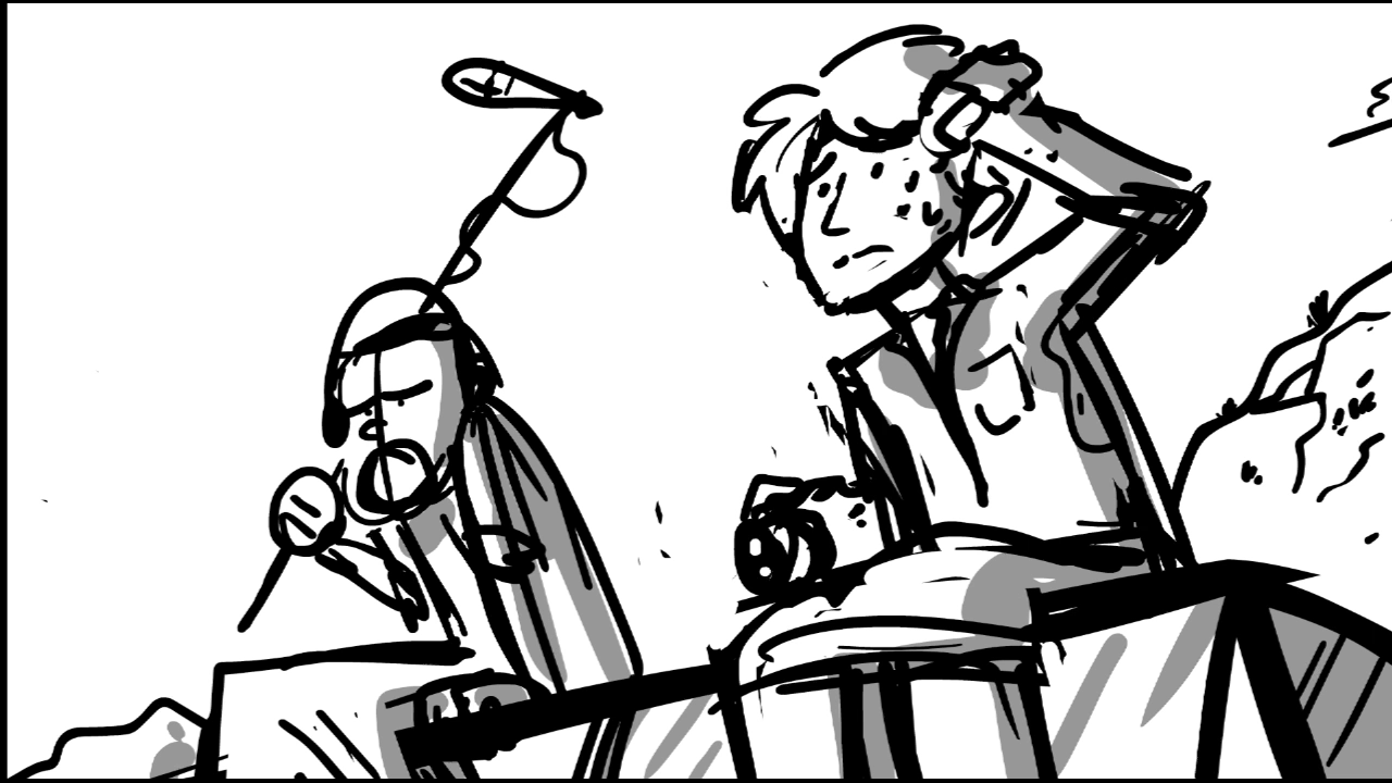 This was the First Iteration on top of the small thumbnails. I explored different endings and sequences. As you can see I had the filmmakers stuck in a desert at first, but would then change locations and film on top of a car near Jeddah's famous Sinking Fish installation. However that turned out to be a little confusing every time I watched it in my head. So I decided to have them just follow the same car in the desert together and end with a shot that reminded me of an old time where I was part of the shooting of a short film in 2013. During that shooting we were all stuffed in the SUV as the driver went crazy on the dirt road following another car. The camera man was sitting in the back squeezed next to the camera man and had to film the whole thing intensely. This was a real experience I went through during college at the Art Institute of Santa Monica. It was a unique experience and was completely profound to me. Those filmmakers ended up losing all the footage they shot during that car chase, but only one shot of myself in an epic pose in the car remained.