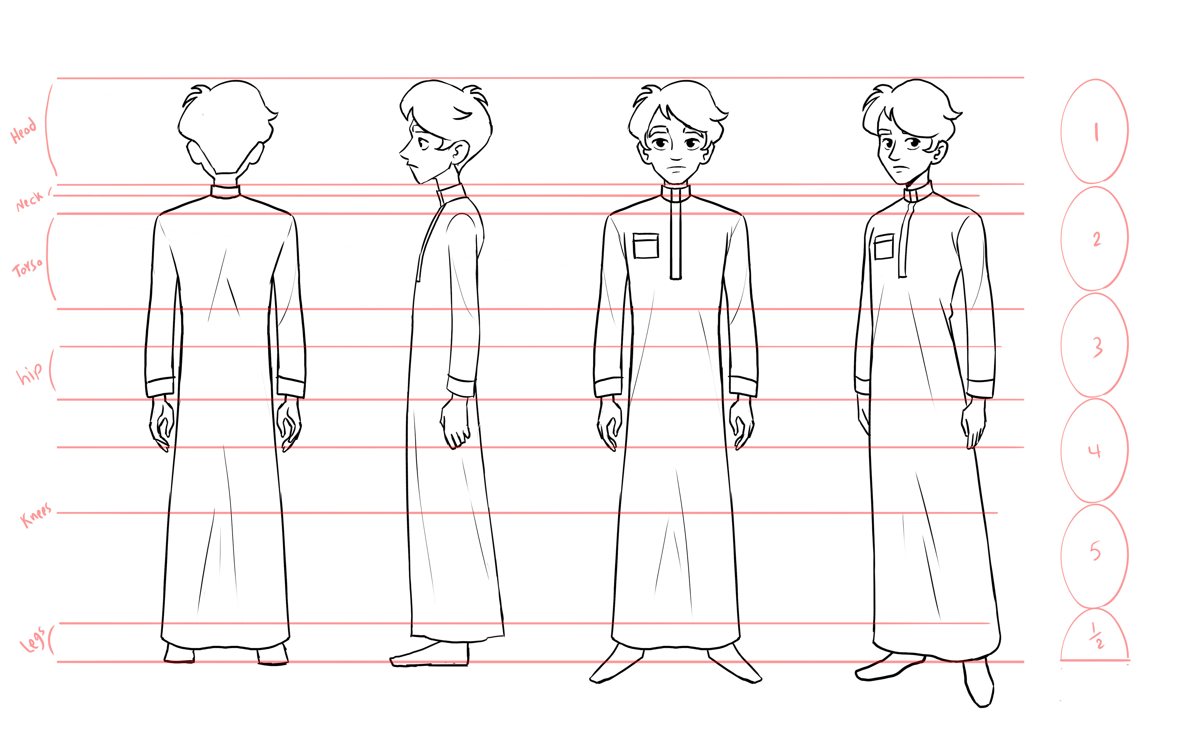The first initial character designs were made by myself. The artist Ahmad Adel then took these sketches and elaborated on them and turned them into great character turn arounds for the Animators to base their work off.
